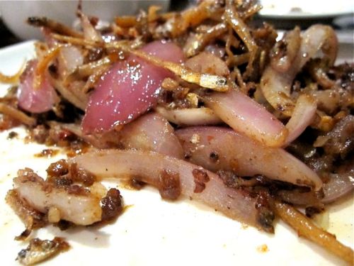 Next up are crispy and chewy fried and dried anchovies in Malaysian belecan sauce… because what’s yummier with your little bits of fishy goodness than some funky shrimp paste and chili seasoning? Nothing. This is one of those dishes that I think helps you figure out whether or not you’re going to get along with someone, like a good blind date dish. You’re either the type of person that looks these little fishies in their eyes, takes a deep whiff of that Chinatown back alley funk and thinks, “Awwwww yeahhhhh, I gotta get me some of this” or you’re that “other” type of person that I don’t usually associate with unless forced to. You know, the type of person that won’t eat anything with eyes or that smells a little fishy… the type of person that you usually catch grimacing and wrinkling their nose as they tiptoe through chinatown holding their pant legs up so they don’t step in anything… the type of person that I literally can’t talk to for more than 5 minutes without antagonizing in some way while my husband grabs my hand under the table, silently begging me not to make another food enemy the way I alienated his second cousin by telling her that Magnolia cupcakes taste like a combination of chalk and dirt, mashed together into a dry cupcake shape, iced with the overly sweet taste of sellout. Where was I going with this? Oh yeah, you either like these little umami bites tossed with more umami goodness, complimented with sweet and tangy barely-cooked red onion crunchiness, or you’re a culture-hating nazi. Ok, maybe not a nazi, but we would not get along…