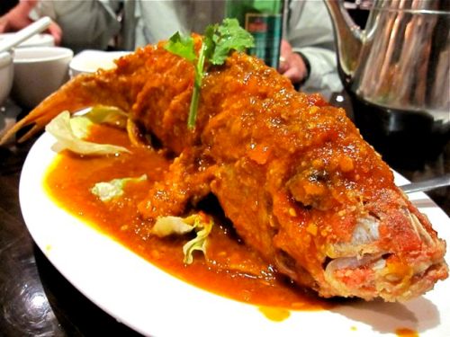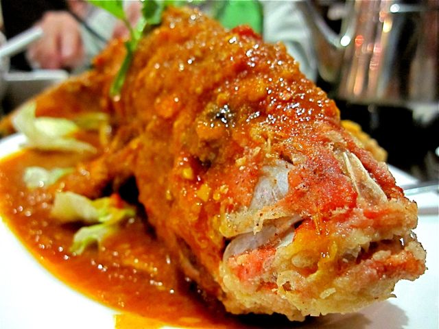 Just keep swimming through your meal, because we’ve got bigger fish to fry… literally. You know what was shocking about my first time eating fish in a non-Asian restaurant when I was a teenager? The fact that the fish came on my plate vs. being served family style and also that its head was missing. No fish head? But then who gets to eat the fish eyeball? Listen, I know – you don’t have to be a nazi to not want to eat a fish eyeball. I will give you that. But all I’m saying is that a fish eyeball is pretty damn good. It has the texture of a stale gum ball – really chewy – but the flavor of really light but savory fish jerky. I’m not selling it, am I? It’s like durian – Westerners can’t stand the smell, but it doesn’t bother me at all because it smells like durian, which is delicious. At New Malaysia, order yourself any of their whole fishes, either fried or steamed. I like the deep-fried red snapper in jawa sauce. What is jawa sauce? It’s delicious. I kept asking the waiter and he would answer by pointing at the sauce on the fish. It’s like asking “who’s on first?” What is jawa sauce? It’s the sauce that comes with the deep-fried red snapper. I kept asking, he kept repeating that answer until I asked him if I was being punked and he just stared at me blankly. I googled it later and Jawa is an Indonesian island so I’m guessing jawa is not an ingredient, but just refers to the style of sauce. All I can say is that this dish is damn delicious – the sauce has a meaty savoriness to it that’s so perfect with the crispy snapper skin underneath and the pale, juicy, flaky flesh. It’s like wearing a perfectly cut and draped, sleeveless velvet cocktail dress to a holiday party. At least I think it is – I usually show up at holiday parties in jeans with at least 3 shots of Don Nacho tequila warming my system. Not anymore, though, cuz I’m a mom! So don’t call social services on me just yet, people!